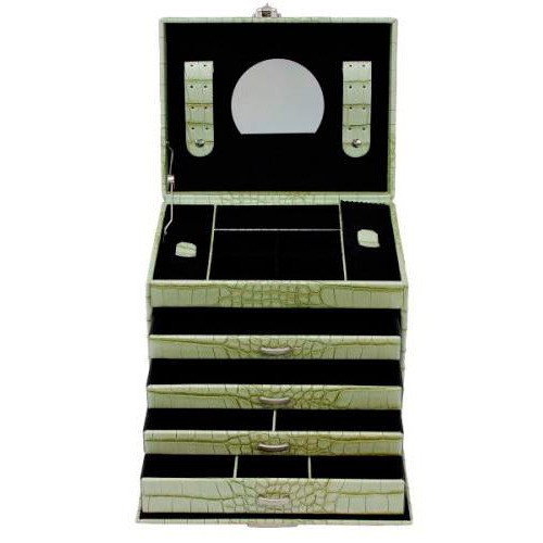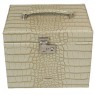 Скринька 3869/2 з лімітованої серії колекції Kroko від німецького виробника "WINDROSE" виконана з високоякісної синтетичної шкіри з тисненням крокодила, що імітує структуру шкіри, всередині скринька оздоблена оксамитом чорного кольору, який і вигідно підкреслить красу Ваших прикрас. Скринька оснащена замком-заскочкою, що замикається на ключ. Дана скринька є найбільшою в колекції Kroko. Кришка оснащена зручною ручкою для перенесення, на внутрішній стороні кришки розташоване невелике дзеркальце і два ремені для підвісу сережок.