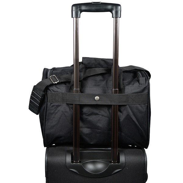 - Додаткова ручка на тильній стороні для кріплення та транспортування сумки на висувній рукоятці основного багажу.