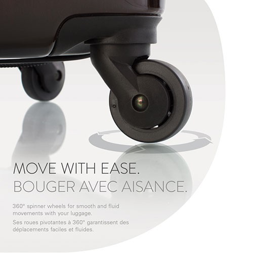 Валіза оснащена чотирма повноповоротними колесами Spinner з можливістю незалежного розвороту кожного колеса на 360°. Системою передбачено рівномірний перерозподіл навантаження на кожне колесо, що у свою чергу сприяє плавному коченню та маневреності валізи, докладаючи при цьому мінімум зусиль.
