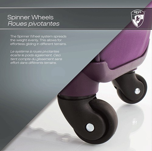 Валіза оснащена чотирма повноповоротними колесами Spinner з можливістю незалежного розвороту кожного колеса на 360°. Системою передбачено рівномірний перерозподіл навантаження на кожне колесо, що у свою чергу сприяє плавному коченню та маневреності валізи, докладаючи при цьому мінімум зусиль.