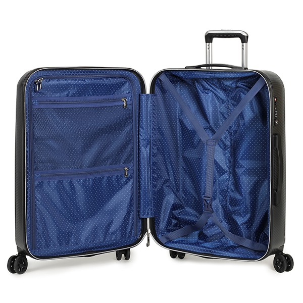 - Эластичные компрессионные ремни для фиксации багажа; Пластиковые ножки для придания устойчивости; Материал повышенной прочности; Выдвижная телескопическая ручка; Встроенный кодовый замок системы TSA