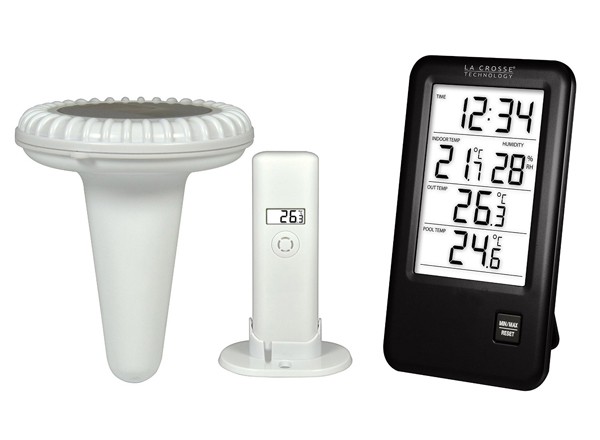 Метеостанція La Crosse WS9068IT-BLA вимірює температуру та вологість у приміщенні, температуру повітря зовні приміщення, а завдяки додатковому термодатчику-поплавцю, вимірює температуру води у басейні.