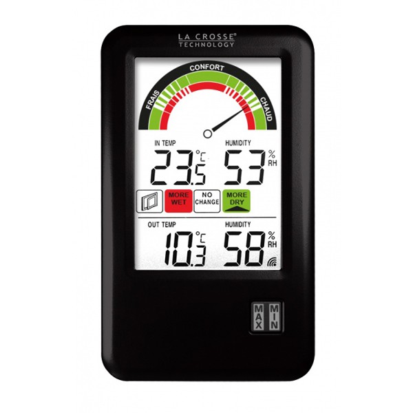 Метеостанція La Crosse WS9070IT-BLA здатна аналізувати показники температури та вологості повітря всередині та зовні приміщення та на підставі отриманого результату сигналізувати про необхідність провітрювання для досягнення оптимального рівня комфорту в приміщенні. Оснащена кольоровим індикатором рівня комфорту у приміщенні, індикатором передбачуваної зміни рівня вологості при провітрюванні приміщення, а також індикаторами необхідності провітрювання приміщення ("відкрити вікно" та "закрити вікно"). Можливість встановлення на столі та кріплення на стіні.