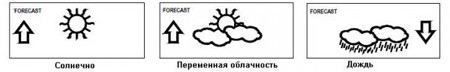 - Символьний прогноз погоди. На дисплеї з'являються піктограми (ясно, хмарно, дощ)