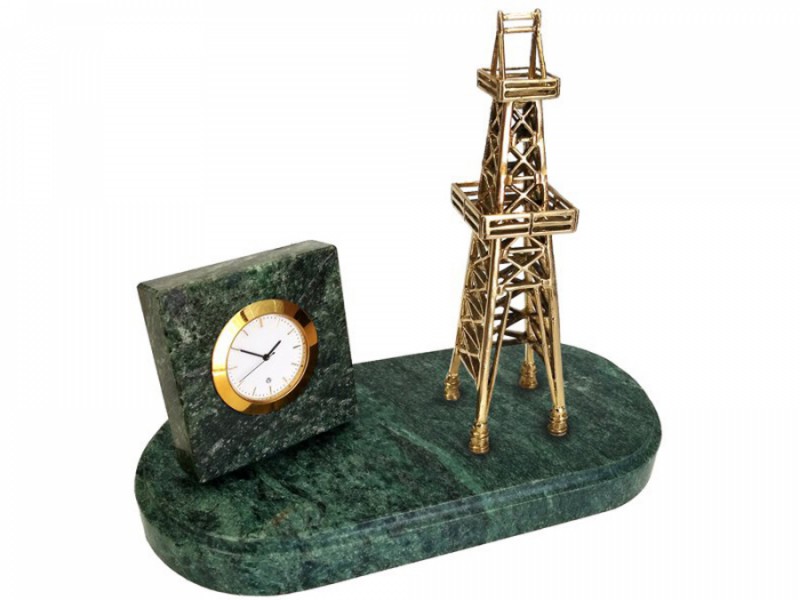 Оригінальний настільний прилад з годинником нафтова вежа виконаний з керамограніту і сталі покритою позолоченим напиленням. Вага настільного приладу 1020 грн. Масивний зовнішній вигляд та зовнішня привабливість роблять цей настільний прилад ідеальним статусним подарунком для керівника. Настільний прилад поставляється у картонній коробці.