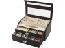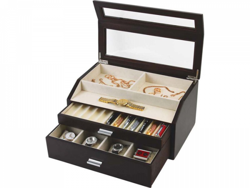 Скринька оснащена безліччю відділень та скриньок для акуратного зберігання годинників та коштовностей. Виконана з дерева та скла, скринька має стриманий, суворий дизайн і відмінно підходить для подарунка жінці і навіть чоловікові.