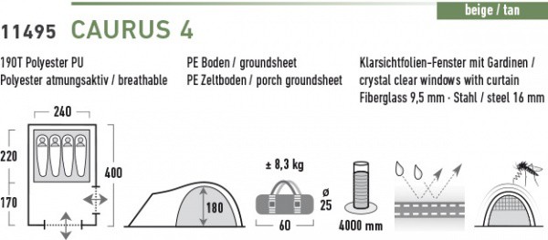 Кемпінговий 4-місний намет для тривалого відпочинку, з роздільним спальним відсіком. Великий тамбур із підлогою ідеально підходить для розміщення багажу або організації кемпінгової кухні, а наявність двох входів дозволять використовувати її як у базовому таборі, так і для сімейного відпочинку на природі. Козирок тамбура встановлюється на сталеві стійки, москітна сітка на вході в спальне відділення, проклеєні тентові шви, вентиляційний клапан забезпечують необхідний комфорт.
