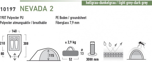 Туристичний двошаровий, 2-місний намет High Peak Nevada 2 Gray для нетривалих походів з одним входом. Зручний тамбур для речей, захищений від негоди вхід із захисною сіткою, вентиляційний клапан, просте встановлення.