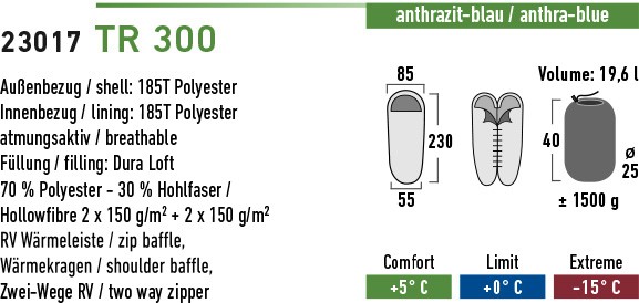 Характеристики товару Спальний мішок High Peak TR 300 / +0°C (Left) Black/blue