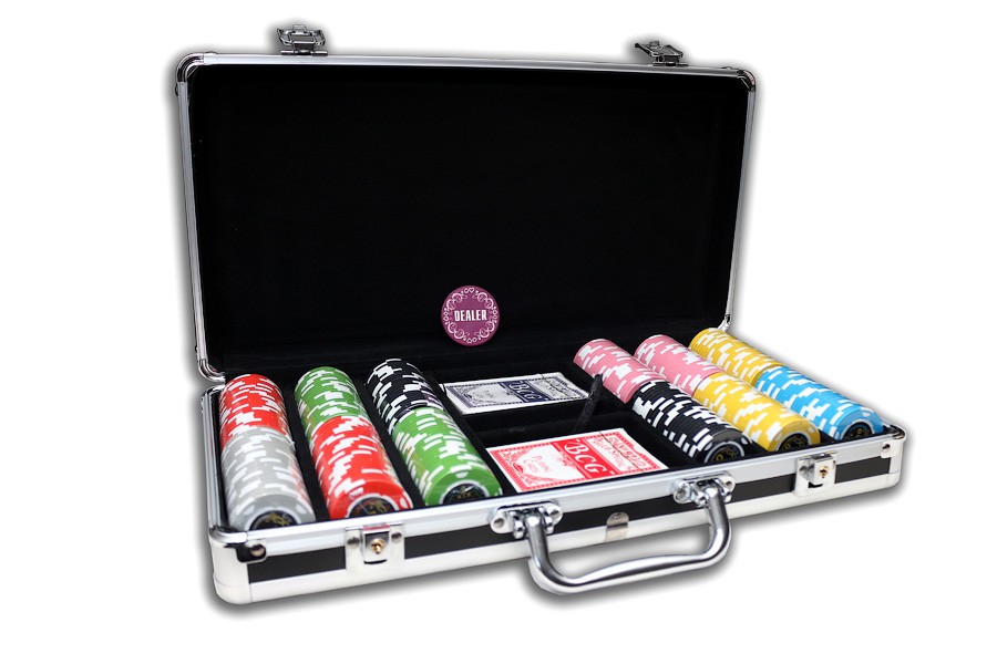 У комплект набору входять гральні карти, кнопка дилера та покерні фішки (300 шт.):
