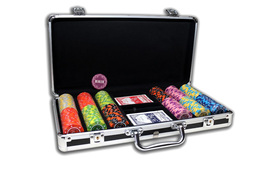 У комплект набору входять гральні карти, кнопка дилера та покерні фішки (300 шт.):