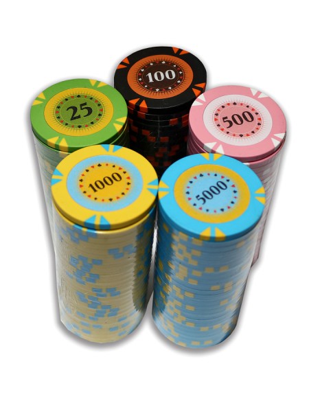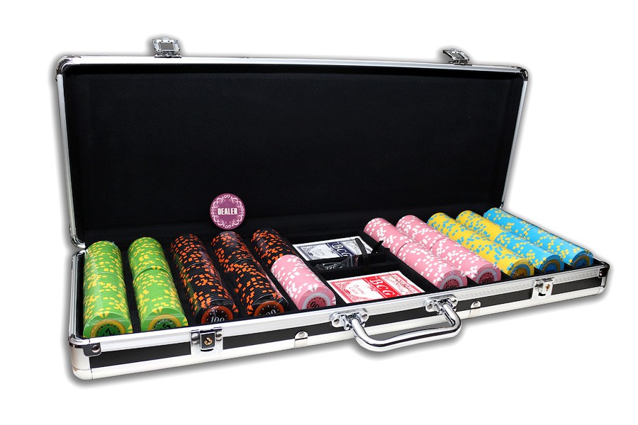 У комплект набору входять гральні карти, кнопка дилера та покерні фішки (500 шт.):