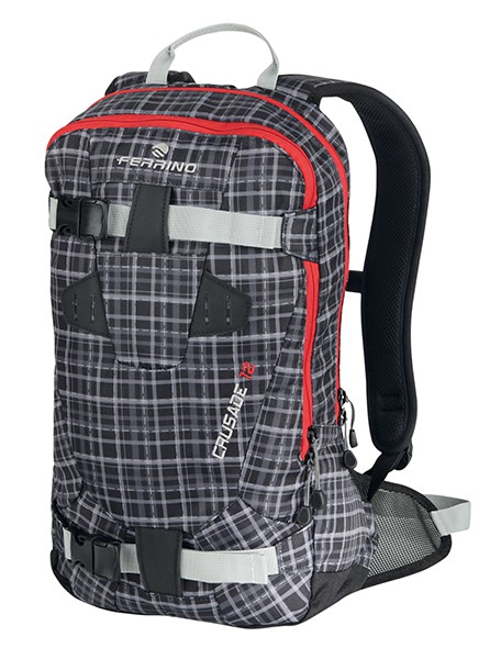 Ferrino Crusade 12 Tartan Black - дуже компактний і в той же час місткий рюкзак для катання на гірських лижах, особливо для любителів лижного фрірайду в стилі беккантрі. Разом з тим особливість конструкції рюкзака дозволяє його використовувати як міську модель. Модель оснащена спеціальними фронтальними стяжками для кріплення гірських лиж чи сноуборду. Ультралегкий пояс на стегнах і грудна стяжка надійно фіксують рюкзак під час катання і підйомів. Усередині основного відділення рюкзака є перегородка для розміщення гідратаційної системи або гаджета з діаметром дисплея до 13,3", а також сітчаста кишеня на блискавці, оснащена карабіном для ключів. Кишеня має флісову підкладку і може використовуватися для розміщення окулярів. Додаткове відділення також дуже просторе і оснащено двома текстильними тримачами, зручними для кріплення трекінгових палиць, що складаються.