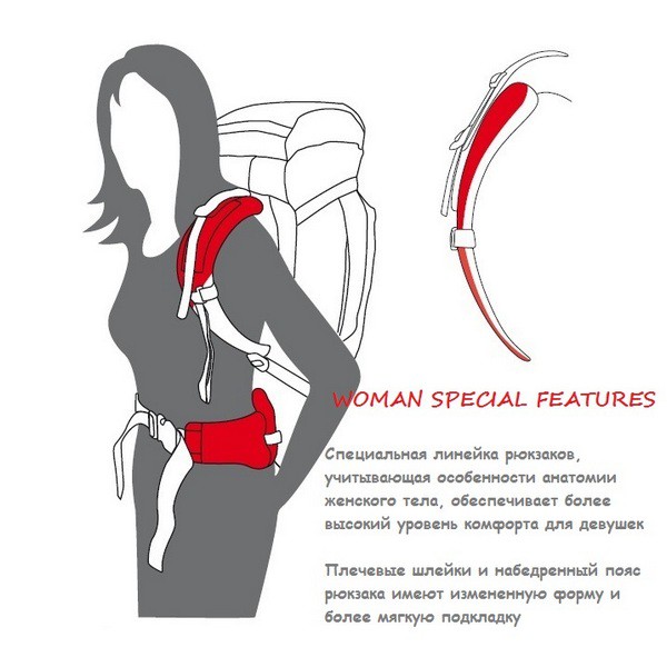 - Плечевые лямки: Регулируемые по высоте, специальной формы, соответствующей женской анатомии с более мягкой пенополиуретановой подкладкой, обшиты дышащей сетчатой тканью.