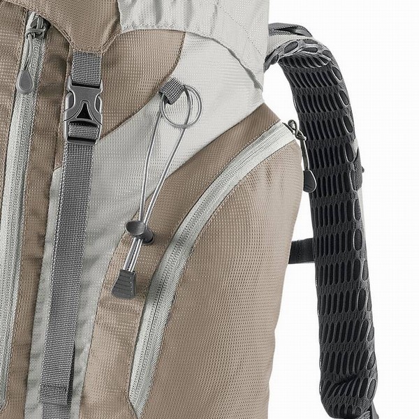 - Ice-axe holders (2) - держатели для ледорубов размещаются в верхней и нижней части фасада альпинистского рюкзака и, как правило, представляют собой комбинацию нижних длинных петель или усиленных шнуров и верхних стяжных эластичных шнуров с фиксатором или небольших стяжек на текстильной застежке velcro. Такие держатели позволяют надежно фиксировать ледорубы и не загружать ими внутреннее пространство рюкзака. При необходимости держатели могут быть использованы и для крепления треккинговых палок. Данный рюкзак имеет две пары креплений для ледоруба, совмещенных с креплениями для треккинговых палок