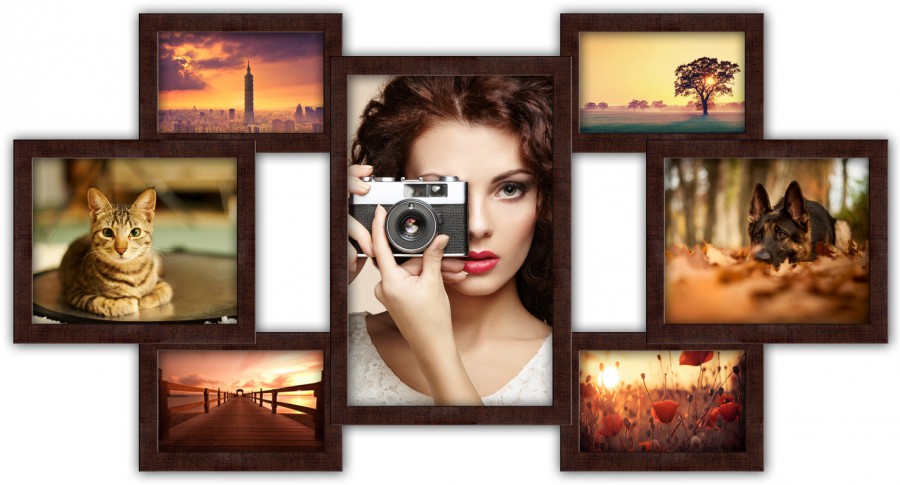 Мультирамка на 7 фото "Сім бажань", коричнева. Розмір мультирамки 85х40 см. Мультирамка складається з 4 фото 10х15 см, 2 фото – 15х20 см та 1 фото – 20х30 см.