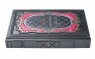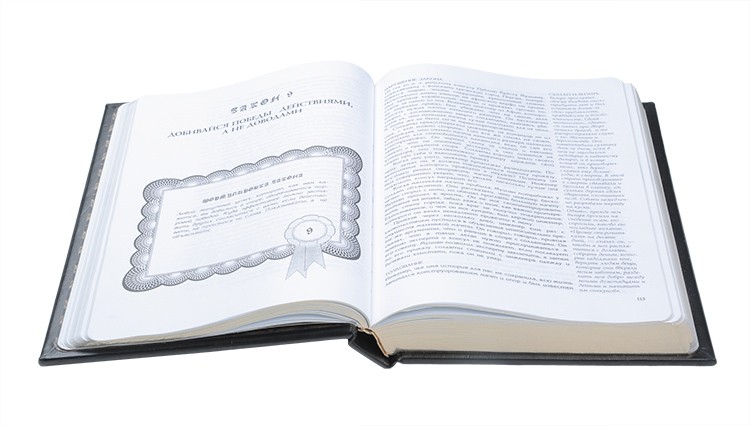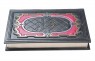 Про переплет: переплет французький цільношкіряний, ручної роботи. Шкіра кольору ебенового дерева (Італія), а також вставка з шкіри кольору "рубін". Рельєф на шкірі і тиснення виконані вручну. Круглі корінці книг прикрашають високі бинти. Обкладинка декорована гравірованою композицією, колір - "золото" з інкрустацією стразами Swarovski. Каптал шовковий, ручної плітки. Форзац складової. Обріз полірований, колір - "золото"