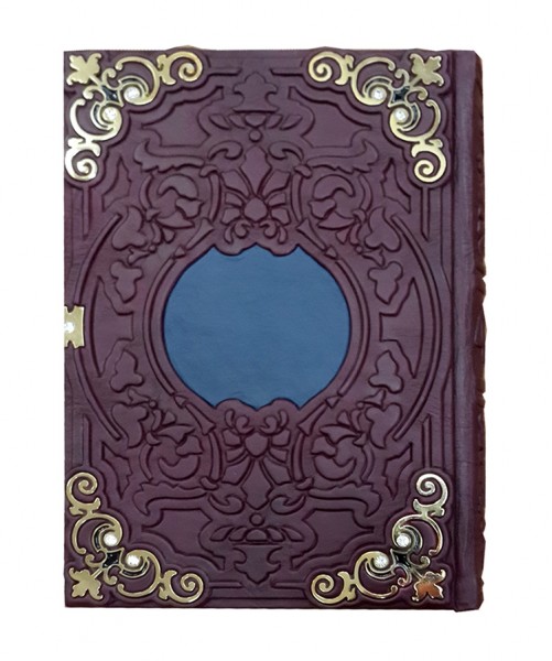 Обкладинка французька, цільно шкіряна, ручної роботи. Колір шкіри "бордовий" із "чорними" вставками (шкіра виробництва Італії). Фурнітура виготовлена з бронзи, покрита чистим золотом проби 999 та інкрустована кристалами "Swarovski". Обріз відполірований вручну та покритий сусальним золотом. Каптал шкіряний. Форзац складовий.