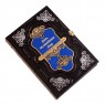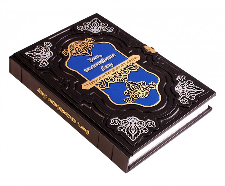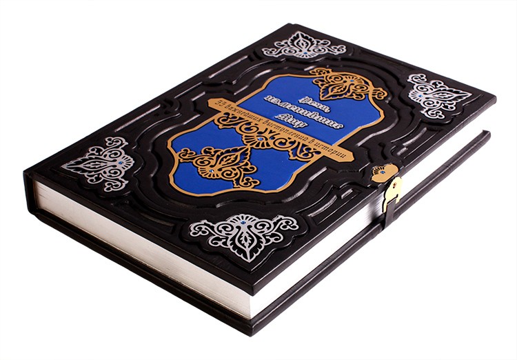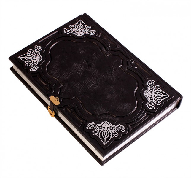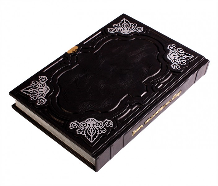 Про палітурку: палітурка французька цільношкіряна, ручної роботи. Шкіра кольору ебенового дерева (Італія), а також вставка зі шкіри кольору "блакитна блакить". Рельєф на шкірі та тиснення виконані вручну. Круглі коріння книг прикрашають високі бинти. Обкладинка декорована гравірованою композицією, колір - золото з інкрустацією стразами Swarovski. Каптал шовковий, ручне плетіння. Форзац складовий. Обріз полірований, колір - "срібло".