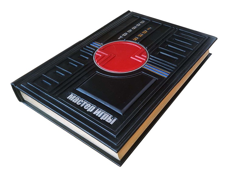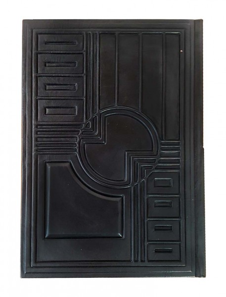 Обкладинка французька, цільно шкіряна, ручної роботи. Колір шкіри чорний із червоними вставками (шкіра виробництва Італії). Фурнітура інкрустована кристалами Swarovski. Обріз відполірований вручну та покритий сусальним золотом. Каптал шкіряний. Форзац складовий.