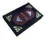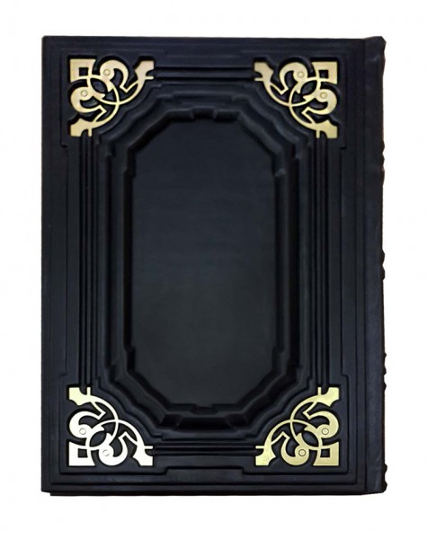 Обкладинка французька, цільно шкіряна, ручної роботи. Колір шкіри "чорний" із вставкою кольору "бордо" (шкіра виробництва Італії). Фурнітура інкрустована кристалами Swarovski. У центрі - художня композиція, обрамлення - гравіювання, колір - "золото" та "срібло". Каптал шкіряний, ручне плетіння. Обріз відполірований вручну та покритий сусальним золотом. Форзац складовий.