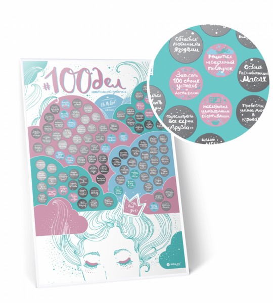 Повісь постер #100 СПРАВ СПРАВ СПРАВЖНІЙ ДІВЧАТКИ в красивому світлому місці. Прокинься вранці з посмішкою, випий філіжанку кави, підійди до плаката і вибери перше завдання. Від душі повеселись у процесі виконання! А потім стирай з іконки стретч-шар – це допоможе тобі зафіксувати свою першу перемогу. Ну, а далі… переходь до наступного завдання. Ти ж знаєш, справжній дівчинці ніколи лінуватися.