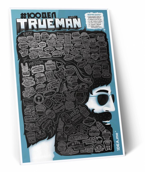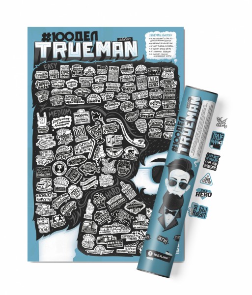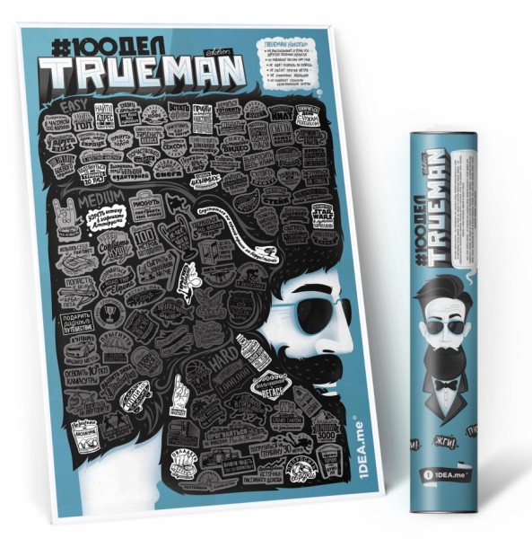 У розкладі сучасного чоловіка немає часу на керування гелікоптером, колку дров та освоєння космосу. А даремно. Ми вирішили це змінити і вигадали сотню справ, на які зазвичай не вистачає то часу, то сміливості. Ми створили #100 СПРАВИ TRUEMAN EDITION для того, щоб витягнути кожного супермена зі звичної міської рутини та робочої суєти. Цей постер не тільки мотивує на здійснення подвигів і встановлення рекордів, а й дозволяє від душі подуріти. Твоє завдання - зробити кожен свій день таким, що запам'ятовується. Наше завдання – допомогти тобі в цьому сотнею крутих і корисних ідей.