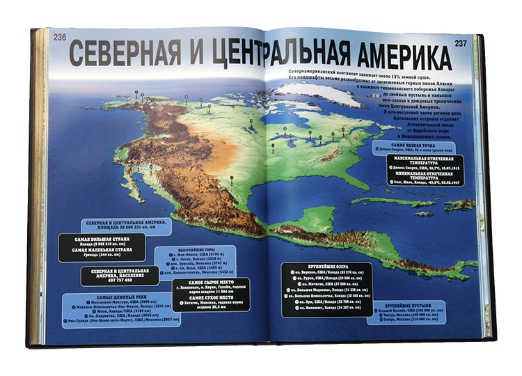 Великий атлас світу наочно та легко показує читачеві всю інформацію про планету Земля. Доступні для розуміння, яскраві та докладні карти ілюструють земну поверхню з дивовижною точністю – на них можна детально розглянути розташування великих і маленьких морів та океанів, високих та низьких гір. Кожна велика карта має інформацію та цікаві факти про зображені об'єкти. Атлас одягнений у шкіряну обкладинку із зображенням глобуса та прикрашений яскравими деталями. Така красива і корисна книга ідеально підійде як подарунок для шефа, колеги чи друга.