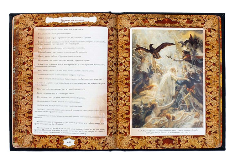Подарункова книга "Мудрість тисячоліття" у французькій палітурці поєднує в собі витонченість ручної роботи та зібрання світових афоризмів від початку писемності до наших днів. Внесок своєї мудрості, який було покладено основою книги " Мудрість тисячоліття " , внесли відомі філософи, історик, і навіть письменники. Таку книгу можна подарувати всім, від малого до великого, кожен знайде у цій книжці свій сенс. Будь то подарунок шефу чи подарунок батькам. Книга у шкірі буде чудовим подарунком.