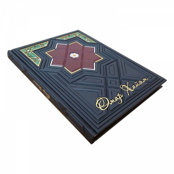 Палітурка французька цільно-шкіряна, ручної роботи. Колір шкіри "темно-синій" із вставками кольору "бордо" та "зелений" (Італія), Кристали «Swarovski». У центрі - художня композиція, обрамлення - гравіювання, колір - "золото" та "срібло". Каптал шкіряний, ручне плетіння. Обріз відполірований вручну та покритий сусальним золотом. Форзац складовий.