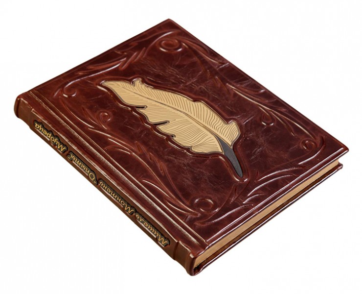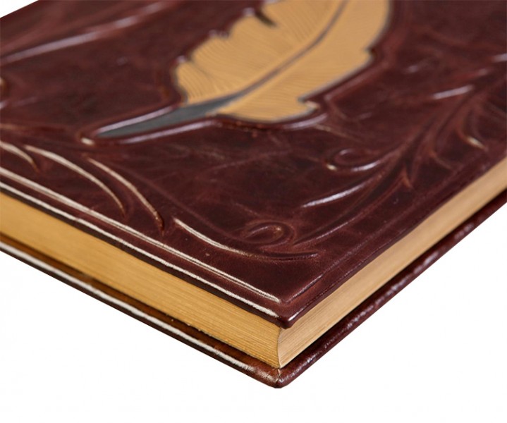 Про палітурку: палітурка французька цільношкіряна. Рельєф та тиснення по шкірі ручної роботи. У центрі – художня композиція у вигляді пера, гравіювання, колір – "золото". Каптал шовковий. Форзац складовий. Обріз полірований, колір - золото.