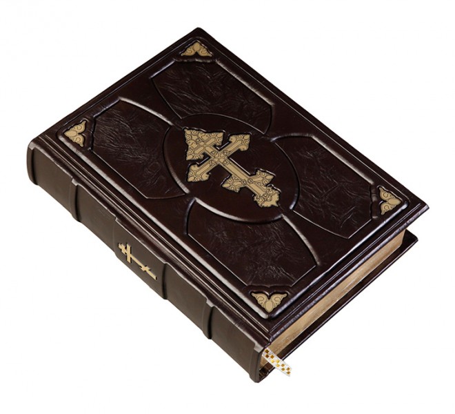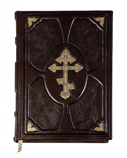 Про палітурку: палітурка французька цільношкіряна ручної роботи. Круглі коріння книг прикрашають високі бинти. Шкіра кольору ебенового дерева (Італія). У середині хрест – гравіювання, колір – "золото". Каптал шовковий, ручне плетіння. Форзац складовий. Обріз полірований, пофарбований вручну, золото колір. Техніки: гравіювання, високий рельєф та тиснення по шкірі.