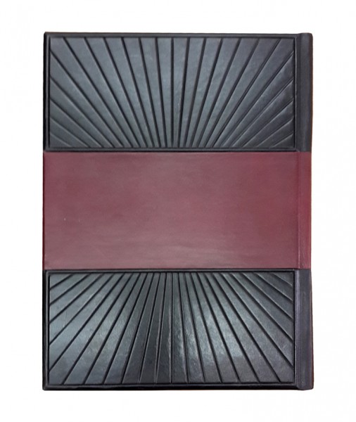 Про палітурку: палітурка французька цільношкіряна ручної роботи. Круглі коріння книг прикрашають високі бинти. Шкіра кольору "ебенового дерева" та "бордо" (Італія). У середині хрест – гравіювання, колір – "золото". Каптал шовковий, ручне плетіння. Форзац складовий. Обріз полірований, пофарбований вручну, золото колір. Техніки: гравіювання, високий рельєф та тиснення по шкірі.