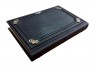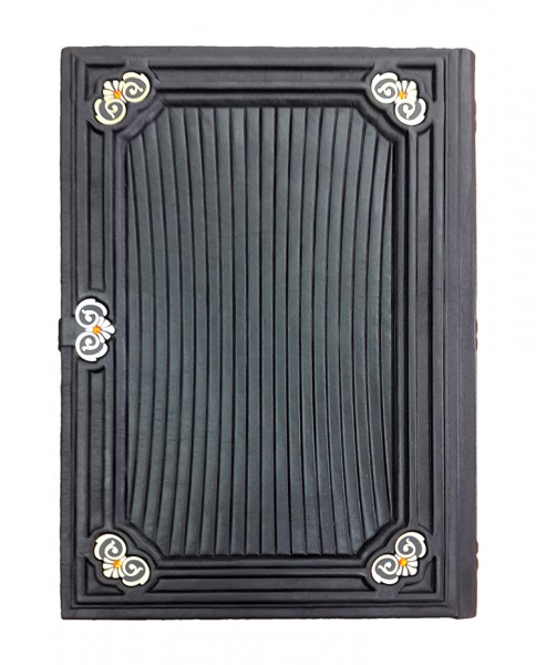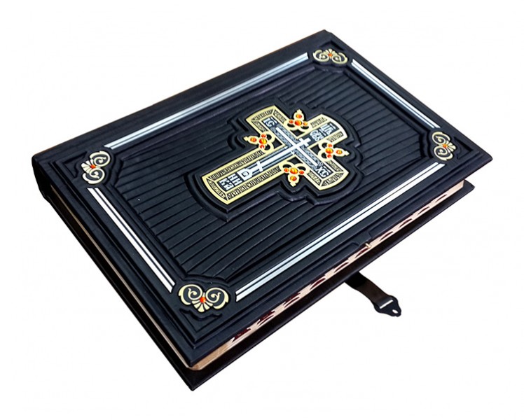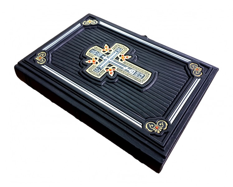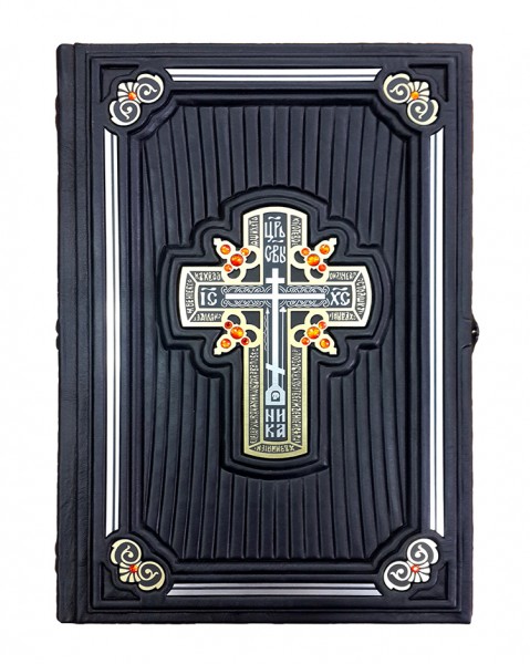 Обкладинка французька цільношкіряна ручної роботи. Круглі коріння книг прикрашають високі бинти. Шкіра ебенового дерева (Італія). У середині хрест – гравіювання, колір – "золото", інкрустований кристалами Swarovski. Книжка закривається на металеву застібку. Каптал шовковий, ручне плетіння. Форзац складовий. Обріз полірований, пофарбований вручну, золото колір. Техніки: гравіювання, високий рельєф та тиснення по шкірі.