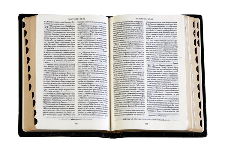 Святе Письмо в Синодальному перекладі. Збережено посторінкове розташування тексту. Рисовий папір з індексованими сторінками. Надрукована з благословення Олексія Другого.