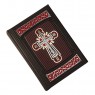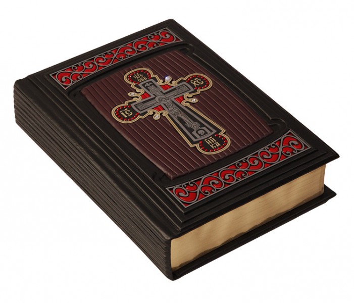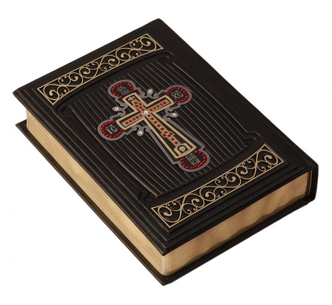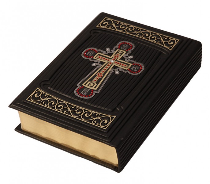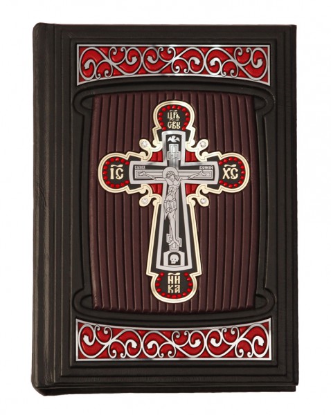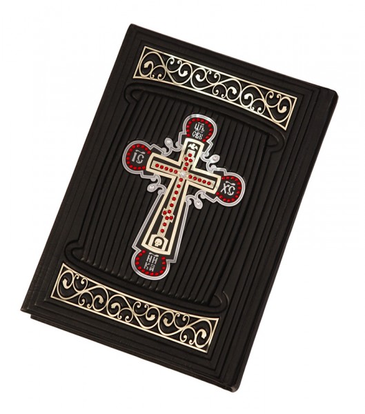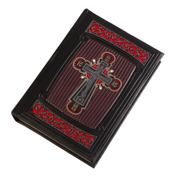 Обкладинка французька цільношкіряна ручної роботи. Круглі коріння книг прикрашають високі бинти. Шкіра кольору "ебенового дерева", а також шкіра "бордо" (Італія). У середині хрест – гравіювання, колір – "золото" та "срібло" інкрустований кристалами Swarovski. Обрамлення – гравіювання, колір – "срібло". Каптал шовковий, ручне плетіння. Форзац складовий. Обріз полірований, пофарбований вручну, золото колір. Техніки: гравіювання, високий рельєф та тиснення по шкірі.
