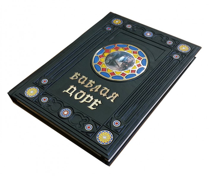 Обкладинка французька, цільно шкіряна, ручної роботи. Колір шкіри "чорний" з "червоними", "синіми" та "жовтими" вставками (шкіра виробництва Італії). Фурнітура виконана з бронзи та покрита чистим золотом проби 999, прикрашена кольоровими ювелірними емалями та інкрустована кристалами "Swarovski". Обріз відполірований вручну та покритий сусальним золотом. Каптал шкіряний. Форзац складовий.