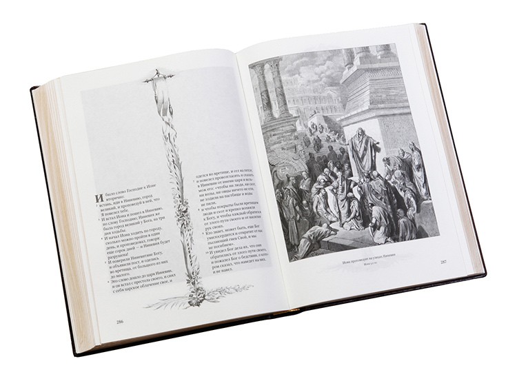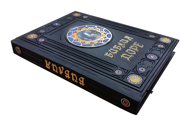 У цій книзі тексти Старого та Нового заповітів ілюстровані розкішними гравюрами відомого художника 19 століття Ґюстава Доре. До видання включено 184 ілюстрації. Книга буде чудовим подарунком будь-якій людині. Центральна композиція та деякі деталі фурнітури повторюють відомий вітраж – троянду собору Паризької Богоматері.