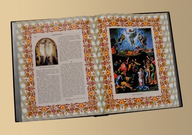 У цьому подарунковому ілюстрованому виданні зібрані тексти П'ятикнижжя Мойсея, що входять до Старого Завіту, та Євангелій від Матвія, Марка, Луки та Іоанна, що входять до Нового Завіту. Текст друкується за виданням Московської Патріархії.