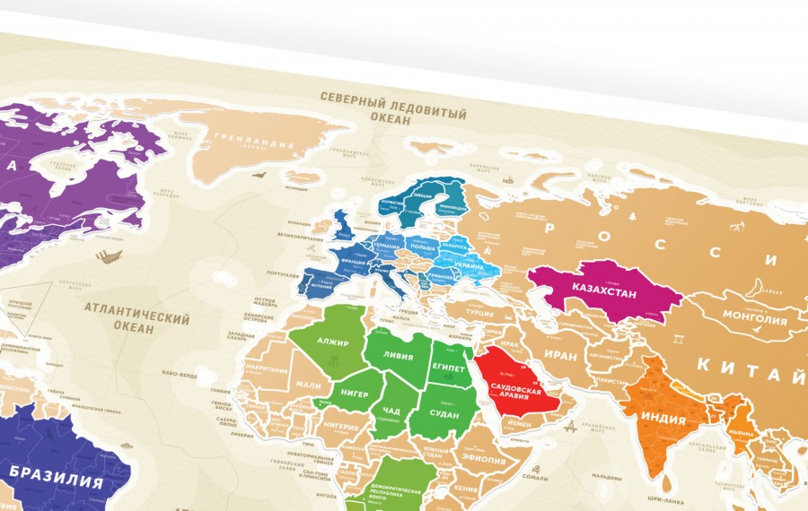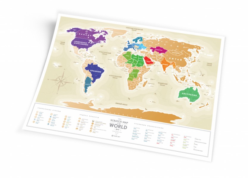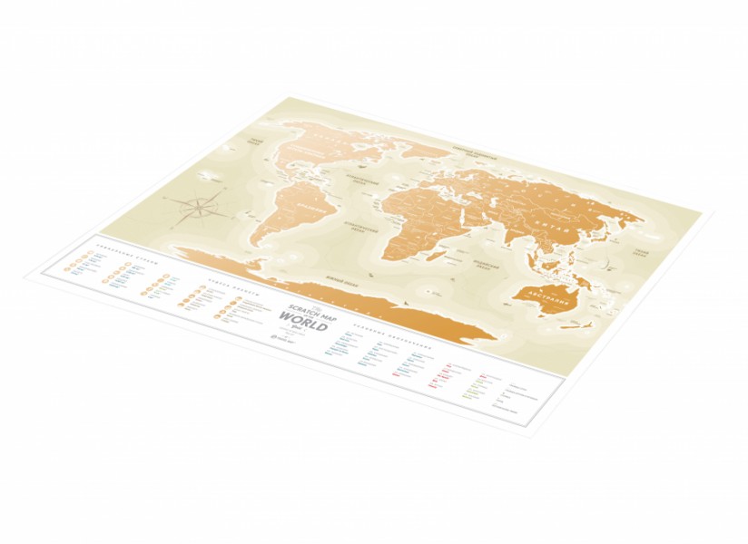 Скретч карта світу Travel Map™ Gold World – це ідеальна, детальна, стильна та лаконічна карта світу російською мовою. Вона вкрита золотистим скретч-шаром, який легко стирається будь-якою монетою.