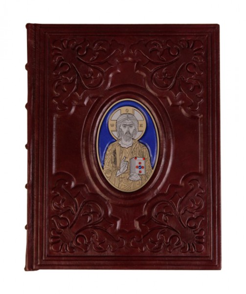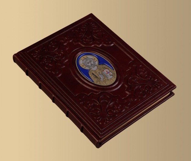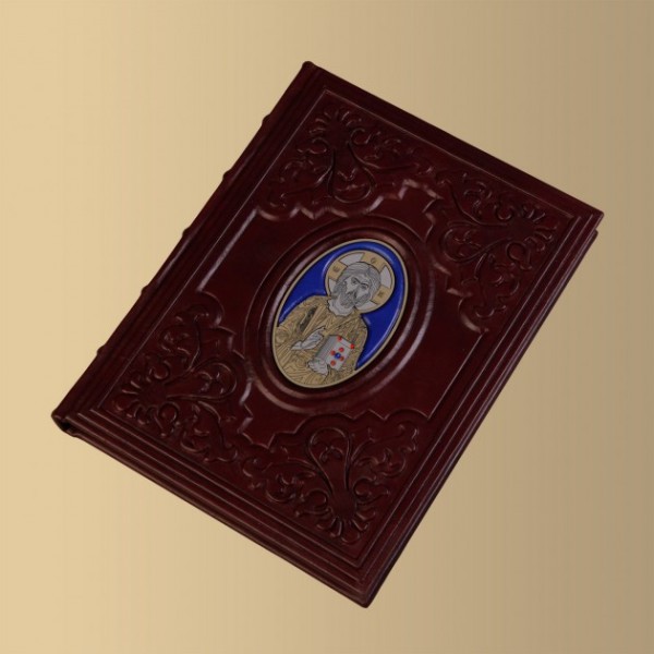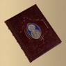 Про палітурку: палітурка французька цільношкіряна ручної роботи. Рельєфні бинти на корінці. Шкіра, колір – "мармований корал" (Італія). У центрі – художня композиція у вигляді картини на полотні, обрамлення – гравіювання, інкрустоване кристалами Swarovski, колір – "золото". Каптал шовковий, ручне плетіння. Форзац складовий. Обріз полірований, колір - золото. Техніки: гравіювання, високий рельєф та тиснення по шкірі.