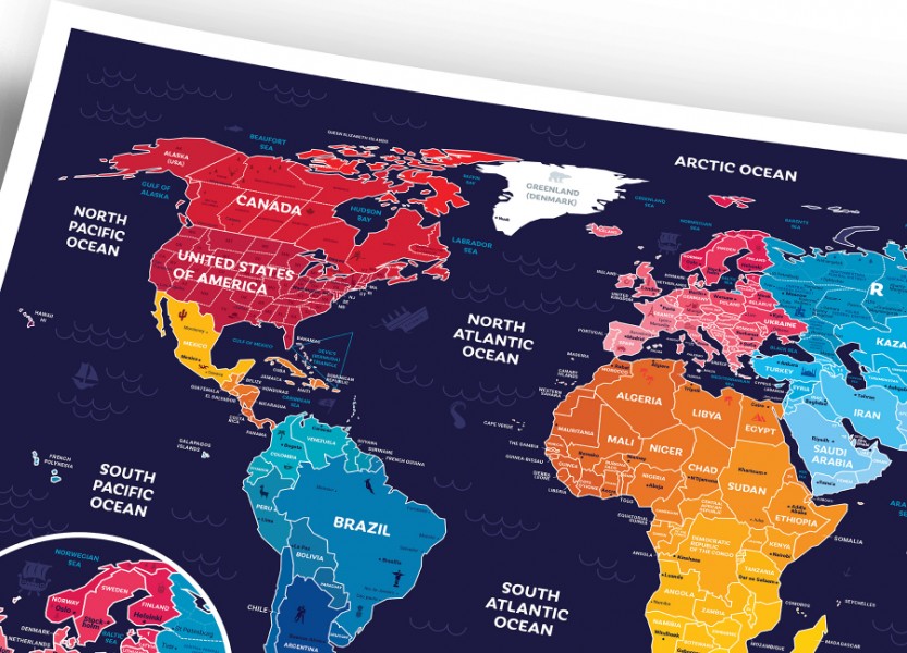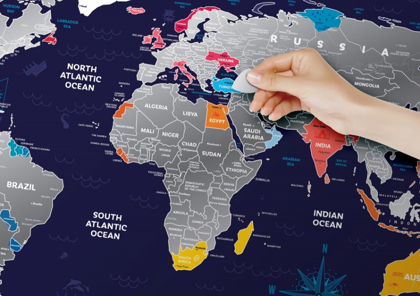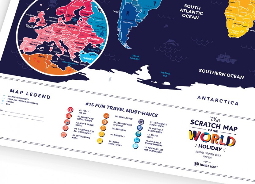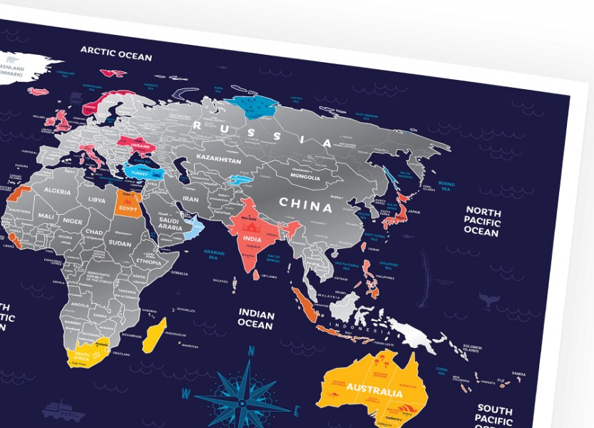 Скретч карта мира Travel Map ™ «Holiday World» — это идеальная, детальная, стильная и лаконичная карта мира на английском языке. Она покрыта специальным серебристым слоем, который легко стирается при помощи обычной монетки.