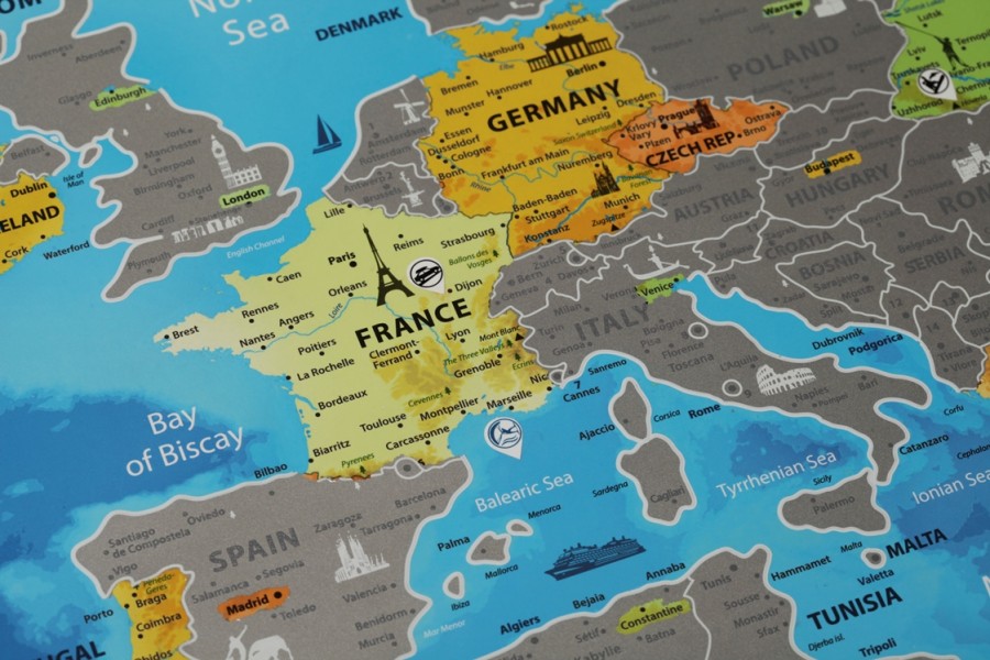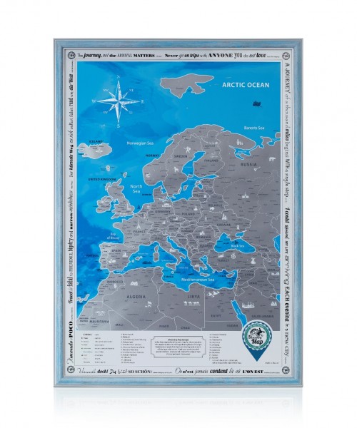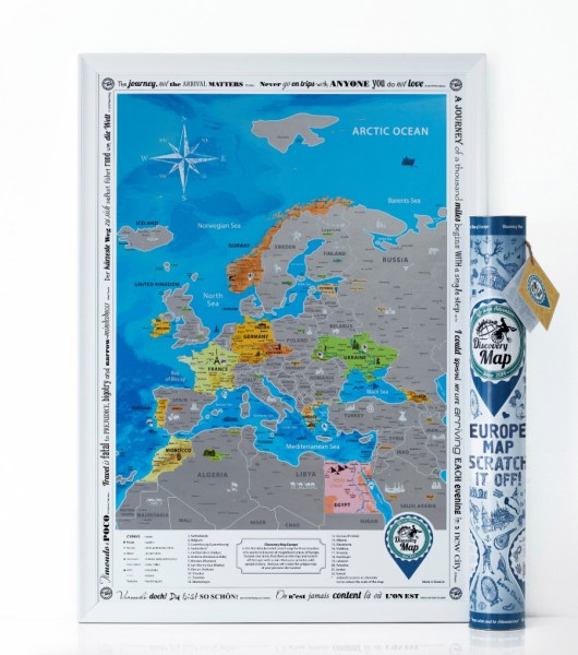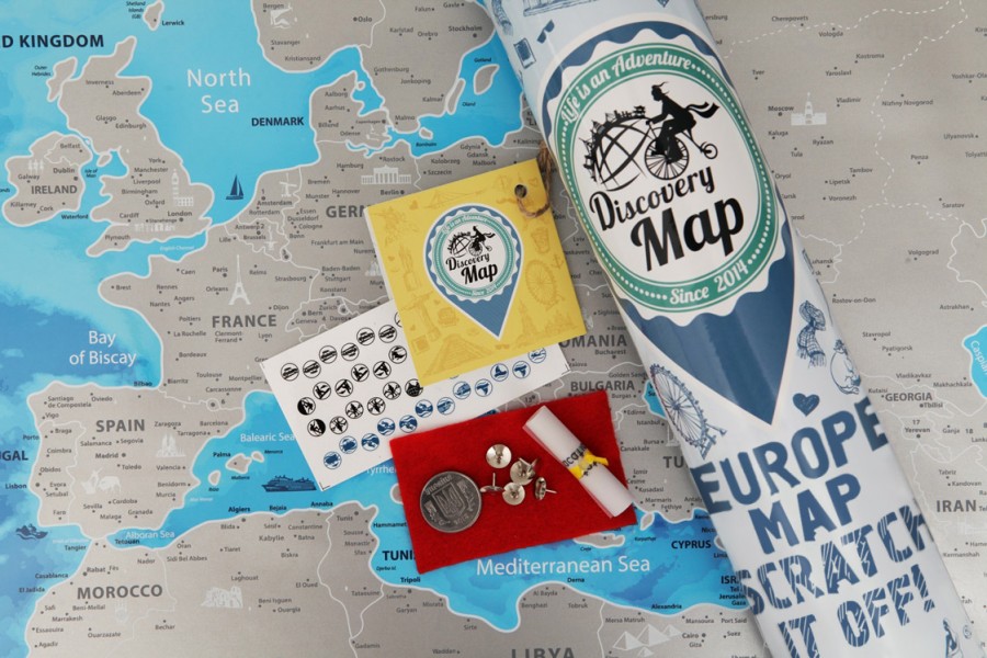 Discovery Map Europe - детальная туристическая скретч карта с рельефом, которая станет лучшим подарком для путешественников, влюбленных в Европу! Посещайте новые страны, ищите их на карте и стирайте с них монеткой скретч покрытие. А свой активный отдых отмечайте на карте специальными наклейками!