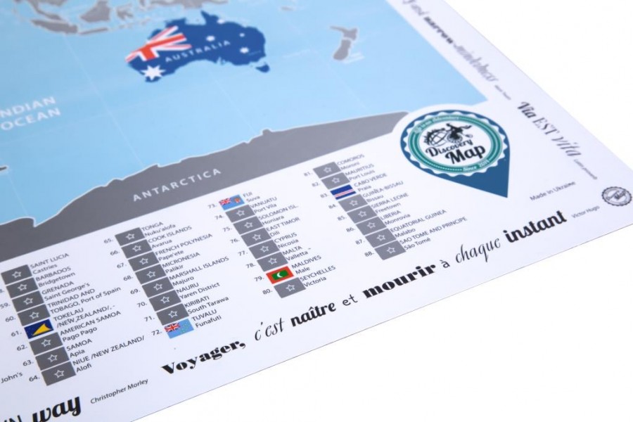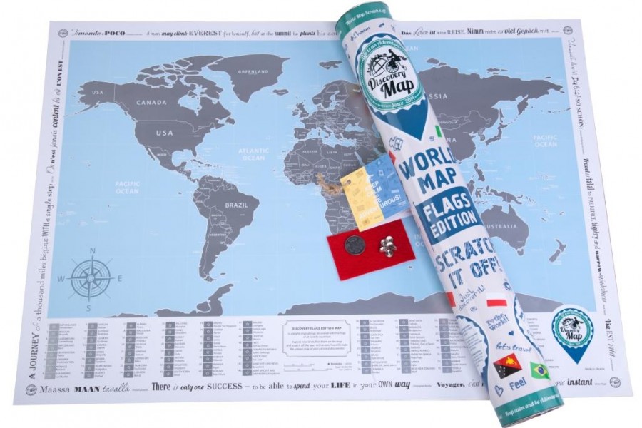 Ця карта покрита якісним сріблястим металізованим скретч шаром, який потрібно прати за допомогою монетки, у тих місцях, де Ви вже побували. Під сріблястим напиленням знаходиться дуже гарна карта світу з містами та прапорами.