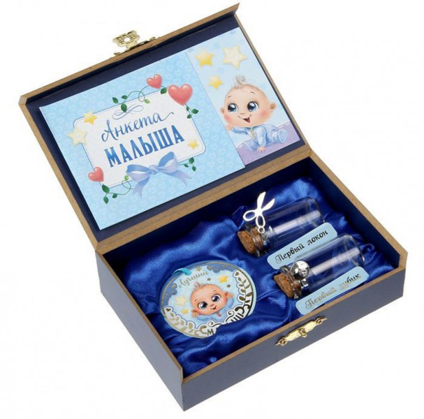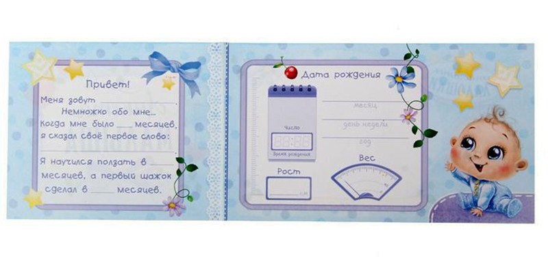 Чудовий набір, для сім'ї у яких з'явився чудовий малюк, за допомогою такого подарунка вони зможу запам'ятати важливі події у житті дитини та заповнити йому анткету.
