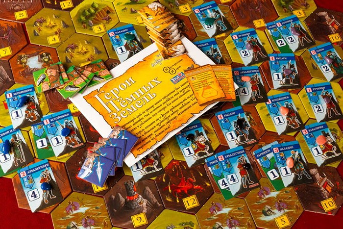 Настільна гра Герої темних земель просто масштабна за кількістю ігрових компонентів: більше 60 тайлів поля (завдяки яким щоразу ви гратимете на новому майданчику), безліч монет, жетонів, маркерів і кілька колод карт. Все це стане вам у нагоді у вашій непростій, але дуже захоплюючій подорожі.