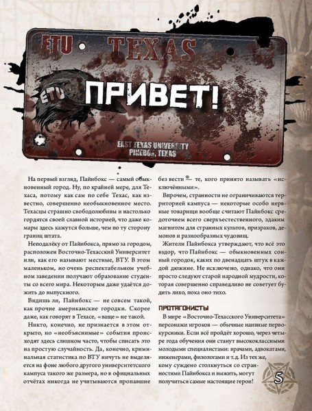 Східно-Техаський Університет - це престижна освіта, згуртоване братство випускників, чудовий південний клімат Пайнбокса, штат Техас... а також докучливі сусіди, кровожерливі (буквально) викладачі та загадкові тварюки, що нишпорять під покровом ночі. Вважай, що тебе попередили.