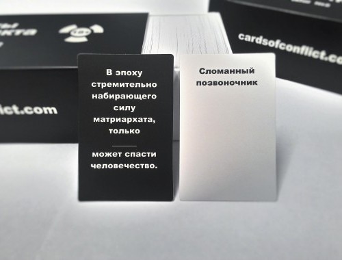 Настільна гра Карти Конфлікту (Cards of conflict) – аналог культової американської гри Cards Against Humanity, яку грають мільйони людей у всьому світі. Тепер і ти можеш поринути у цей світ і на кілька годин забути про всі правила та шаблони.