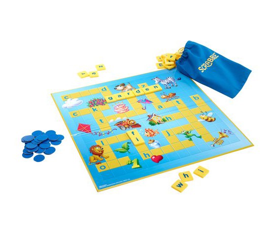 Настільна гра Скрабл дитячий (Scrabble Junior) порадує наявністю двостороннього поля, а отже, відразу двома варіантами гри. Сторона «Слова та картинки» пропонує викладати плашки з літерами на вже вигадані слова. Перед партією відправте всі літери в ганчірковий мішечок і перемішайте, а потім гравці, не дивлячись, дістають з мішка по п'ять клітинок з літерами, і викладають перед обличчям вгору. У свій хід учаснику слід вибрати зі свого набору будь-які дві літери і розмістити їх на полі так, щоб вони відкривали вже існуюче слово, задумане в кросворді. Тепер потрібно добрати з мішечка нові дві літери і передати хід наступному гравцеві, що сидить за годинниковою стрілкою. Якщо у вашому наборі немає жодної потрібної кісточки, можете скинути дві, а замість цього добрати дві нові з мішечка. Гравець, який поставить останню букву і завершить слово, отримує синій жетон. Коли весь кросворд виявиться розгаданим, настане час підрахувати жетони та учасник, який з найбільшою кількістю стане переможцем.