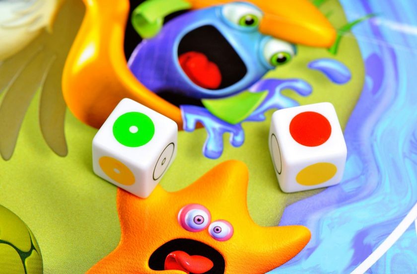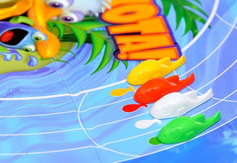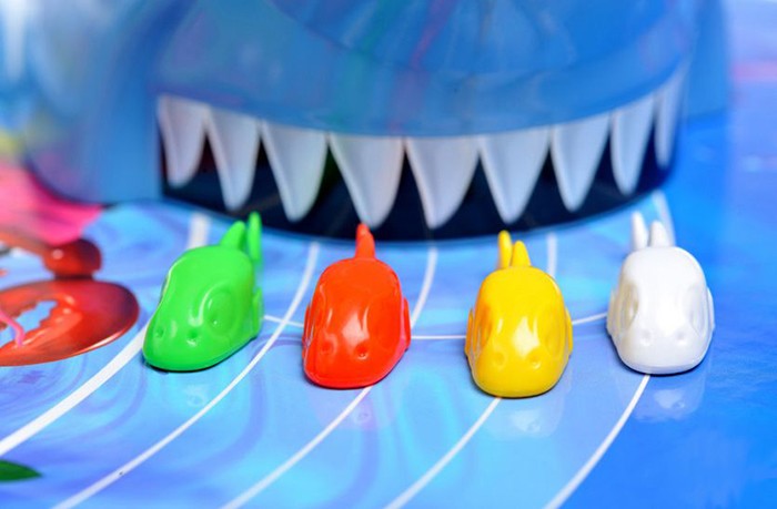 Щоб акула ожила, попередньо «годуйте» її батареєю. Тепер натискаємо кнопку "вкл/вимк" і можна починати. Акула рухається, а вам у цей час потрібно від неї спливти і зробити це можна так. Спочатку найстаршому гравцю буде довірено кинути кубики і оголосити кольори, що випали. У випадку, якщо на обох гранях кубика однаковий колір, гравець називає його двічі, наприклад: синій, синій. Учасники, кому пощастило, і чиї кольори були названі, спонукають своїх рибок на одну клітку вперед – подалі від ненажерливої акули. Відповідно, двічі названий колір – два кроки вперед.